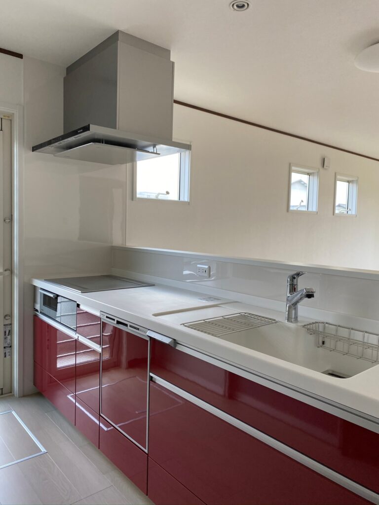 • こだわりのキッチン:落ち着いたモノトーンの空間に、情熱的なレッドカラーのオープンキッチンが鮮やかに映えます 。背面収納も完備し、デザインと使い勝手を両立させました 。